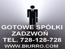 Jeśli zależy Ci na zaoszczędzeniu kilku tygodni czasu, potrzebnego do założenia własnego przedsiębiorstwa - Zadzwoń! Wszystkie Oferowane Spółki (posiadajace numery KRS, REGON oraz NIP) nabędziesz u nas "od ręki". W Naszej ofercie znajdziesz bogaty wybór czystych spółek w cenie od 3500 zł z lat od 1991-2015 roku. tel. 728-128-728 www.biurro.com